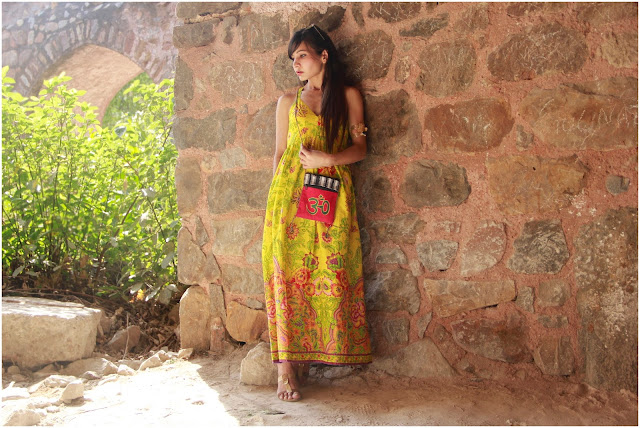 Back to the look, this is a halter neck printed cotton maxi dress. Just perfect for a summer afternoon( even more perfect for a beach). And whats not to like about the dress, everything is just tailor-made for summer, the color, the design, the print and especially the length. I teamed it up with a short Nehru collared jacket. Gladiator style flats, reflectors, a khadi sling pouch and an arm cuff added to the quirkiness of the look.